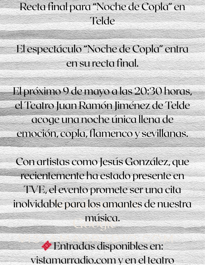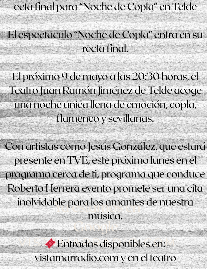 En este programa tiene cabida la copla, el flamenco y las sevillanas, además de entrevistas a cantantes y compositores. Comentamos el movimiento de los artistas. Dos horas donde el tiempo vuela recordando el Pasado de los grandes del genero. Puedes escucharlo en: 8 9,2 FM.